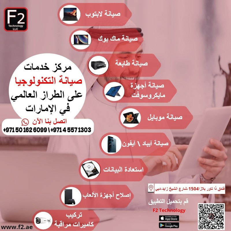 https://i.suar.me/mwPEj/m خبر عاجل: استعادة البيانات مجانا 0501626099 خبر عاجل: صيانة كومبيوتر مجانا 0501626099 خبر عاجل: صانية لابتوب مجانا 0501626099 F2 Technology LLC شركة متخصصة في إصلاح أجهزة الكمبيوتر المحمولة والطابعة ووحدة التحكم في الألعاب و MS Surface Pro وخدمة استعادة البيانات و الدوائر التلفزيونية المغلقة. لدينا فنيو خدمة متحمسون ومتفانون متاحون لمساعدتك في أسرع وقت ممكن. نحن متخصصون ولدينا طريقة موجهة لإصلاح الجهاز بشكل عاجل و تسليم جهازك في الوقت المناسب. لدينا أحدث طريقة لإبقاء العملاء على اطلاع خلال كل مرحلة من مراحل إصلاح الجهاز. نحن نقدم تكلفة معقولة مع خدمة إصلاح الكمبيوتر المحمول عالية الجودة. نحن متخصصون في خدمة إصلاح تكنولوجيا المعلومات متعددة العلامات التجارية في الإمارات العربية المتحدة. نحن نقدم تجربة أفضل وأكثر راحة ، ونحن نقدم خدمة الاستلام والتوصيل المجانية. لذلك ، إذا كنت تواجه مشكلة في الكمبيوتر المحمول أو في حالة تلف أي جزء من الكمبيوتر المحمول ، فما عليك سوى الاتصال بنا لحجز موعد للاستلام والتسليم. يتمتع خبراء مركز خدمة إصلاح تكنولوجيا المعلومات لدينا بأكثر من 15 عاما من الخبرة في التعامل مع مواطن الخلل التقنية لأجهزة الكمبيوتر المحمولة والهواتف المحمولة وأجهزة الكمبيوتر والطابعات. خدمة إصلاح ماك بوك في دبي احصل على خدمات إصلاح ماك بوك عالية الجودة في دبي والشارقة. نحن نقدم خدمة إصلاح MacBook بأسعار معقولة ، سواء كانت مشكلة في البرامج أو الأجهزة. نؤكد لك أننا سنرد عليك في أقرب وقت ممكن مضمونا. يمكن للفنيين المعتمدين لدينا تشخيص وإصلاح جميع المشكلات المتعلقة بأي طراز من أجهزة MacBook وiMac. سنتحقق من الكمبيوتر المحمول بسرعة ونعود إليك مع عرض أسعار. يرجى تزويدنا بتفاصيل الاتصال الخاصة بك حتى يتمكن خبراؤنا من فحص مشكلتك والرد عليك باستفساراتك. يمكنك الوثوق بنا مع سريتك. نحن نقدم جميع الموديلات خدمة إصلاح iPhone. احصل على إصلاح جهاز iPhone الخاص بك في غضون يوم واحد! خدمة إصلاح الطابعات في دبي نحن نقدم أفضل خدمة لإصلاح الطابعات باستخدام أدوات متقدمة تقنيا في مركز خدمة إصلاح الطابعة وعتبة الباب. لدينا دعم الموظفين ذوي الخبرة العالية ، الذين لديهم المعرفة التقنية الكاملة وحل مشكلتك بشكل مثير للإعجاب وكفاءة. نحن المتخصصة في خدمة إصلاح طابعة الكمبيوتر عتبة الباب. الدوائر التلفزيونية المغلقة بأسعار معقولة في دبي بصفتنا موردا ومثبتا للكاميرات المغلقة عالية الجودة ، فإننا نفي بتخصيص مخصص لتركيب الدوائر التلفزيونية المغلقة وأفضل جودة CCTV لتناسب أي مكان وبشروط معقولة. لدينا صفات مثل الصيانة والتركيب وتقديم الخدمات عبر المواقع التجارية والمنزلية. كما نقدم الخدمة في جميع أنحاء الإمارات العربية المتحدة. إذا كنت تبحث عن أفضل تثبيت لنظام الدوائر التلفزيونية المغلقة الافتراضية بأسعار معقولة ، فإن بحثك ينتهي فينا. تقدم F2 Technology LLC أفضل نظام CCTV في الإمارات العربية المتحدة. من المهم معرفة مزود خدمة تركيب الدوائر التلفزيونية المغلقة مع مجموعة واسعة من المعدات المختلفة والنظام المناسب لهدفك. خدمة استعادة البيانات في الإمارات العربية المتحدة لدينا فريق محترف مؤهل تأهيلا عاليا قادر على استعادة البيانات المفقودة. نحن في F2 technology LLC نقدم استعادة البيانات من القرص الصلب ، واستعادة محركات الأقراص الصلبة لسطح المكتب ، واستعادة محركات الأقراص الصلبة للكمبيوتر المحمول ، واستعادة SSD ، واستعادة RAID بأفضل سعر في دبي. خدمة إصلاح PS4 في الإمارات العربية المتحدة نحن نقدم إصلاح وحدة تحكم الألعاب في الإمارات العربية المتحدة. يمكننا في F2 أن نفهم مدى قلقك في إصلاح وحدة التحكم في الألعاب الخاصة بك في حالة عمل مثالية ، لذلك ، نقدم خدمة إصلاح في نفس اليوم ، أو بحد أقصى يوم واحد. احصل على إصلاح بلاي ستيشن الخاص بك بأفضل الأسعار، وإصلاح Xbox في دبي وجميع الموديلات خدمة إصلاح نينتندو في الإمارات العربية المتحدة. توصيل 