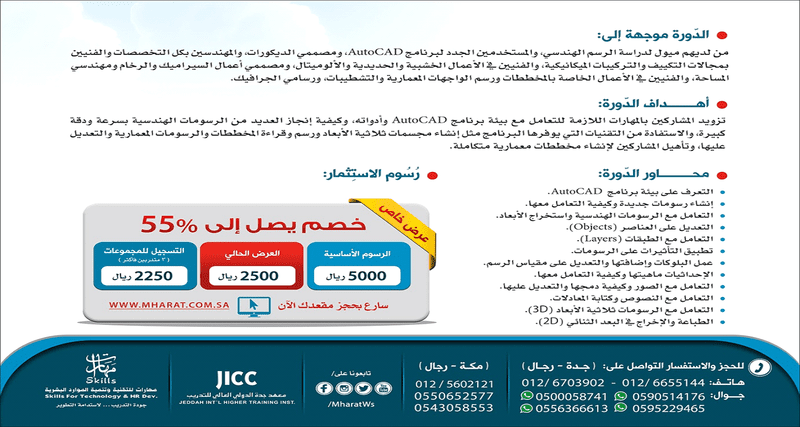 بدأ التَّسجيل في دورة ... (( التصميم المعماري )) احترف التصاميم ثنائية وثلاثية الأبعاد ... باستخدام أشهر برامج الرَّسم الهندسي AutoCAD https://i.suar.me/oLplm/m مدة الدورة أربعة أسابيع شهادة الدورة معتمدة من المؤسسة العامة للتدريب التقني والمهني (( للاستفسار نرجو التواصل عبر الجوال أو الهاتف )) مدينة جــــدة 0590038494 -- 0590514176 0595229465 -- 0556366613 0500058741 -- 0126655144 مدينة مكة المكرمة 0125602121 -- 0125435098 0543058553 -- 0550652577 (( سارع بحجز مقعدك الآن وسجل عبر الرابط التالي )) مهارات للتدريب https://i.suar.me/71axo/m لا تنسى حجز مقعدك في إحدى دورات التصاميم المميزة مهارات للتدريب https://i.suar.me/Vez0w/m |