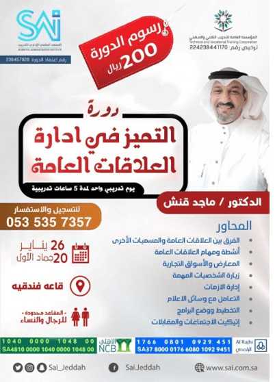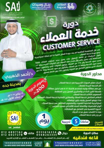 اقوى وافضل الدورات بأرخص الأسعار شهادات معتمدة من مقام المؤسسة العامة للتدريب التقني والمهني سنستقبل سنةً جديدة تحمل معها أملاً جديداً بمستقبلٍ يملؤه النجاح والتقدم المعهد العلمي الإداري للتدريب يقدم لكم اقوى الدورات التطويرية – اجعل العام الجديد بداية لتطورك العلمي والعملي اهم دورات تطويرية بمدينة جدة *يتم تحديث الصفحة بصورة مستمرة* برجاء الضغط على صورة الدورة او اسم الدورة لحجز مقعدك: تم ترتيب الدورات من التاريخ الأقرب للأبعد دورة استخدام الخريطة الذهنية في الأعمال خلال هذه الدورة سنستعرض إحدى أهم وأقوى وسائل التخطيط التي يمكن للإنسان أن يستخدمها التاريخ: السبت 12 يناير 6 جمادى الاولى من الساعة 5 مساءاً الى 10 مساءاً (مقاعد مخصصة للرجال والنساء) https://i.suar.me/qWWwV/l دورة خدمة العملاء تعتبر خدمة العملاء أهم ركن من أركان الشركة , حيث يجب اختيار موظفي خدمة العملاء بدقة واحترافية لأنهم يمثلون الصورة الذهنية للشركة لدى العميل التاريخ: السبت 19 يناير 13 جمادى الاولى من الساعة 5 مساءاً الى 10 مساءاً (مقاعد مخصصة للرجال والنساء) https://i.suar.me/NZZA4/l دورة التميز في إدارة العلاقات العامة لايوجد أفضل من نصيحة ستيف جوبز، فقد قال عن العلاقات العامة: “ إذا كان لدي دولار زائد، لكنت صرفته علي العلاقات العامة “ التاريخ: السبت 26 يناير الموافق 20 جمادى الأولى من الساعة 5 مساءاً الى 10 مساءاً (مقاعد مخصصة للرجال والنساء) https://i.suar.me/dqqQl/l دورة تطوير مهارات المدرب في التفكير – مدينة جـدة دورة إبداعية مخفضة! https://i.suar.me/8EEnn/l للاستفسارات اتصال او واتساب: 0535357357 جميع الدورات المعلن عنها حاليا بمدينة جــدة قاعة فندقية |