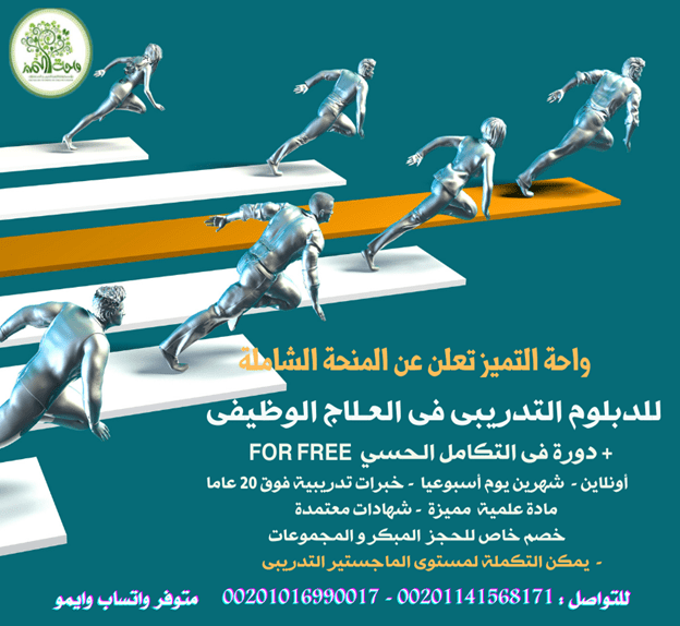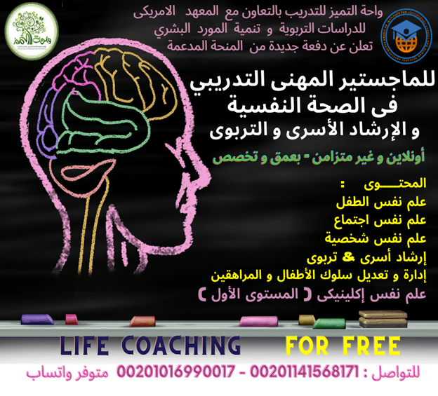أقوى دبلوم فى العلاج بالفن التشكيلى .. أونلاين واحة التميز Art Therapy Diploma انضم للمنحة الشاملة الأقوي فى الوطن العربى للدبلوم التدريبي في العلاج بالفن التشكيلي أونلاين حصريا من واحة التميز للتدريب مصر المدة شهرين يوم أسبوعيا ، اليوم به محاضرتين يوميا بينهما بريك المدربة متخصصة وممارسة للعلاج بالفن : ماجستير و دكتوراة أكاديمية ، على مستويات متخصصة مهنية و أكاديمية عليا خبرة تصل إلى 20 عاما من التخصص والعمل الأكاديمي و المهنى ، فى مستشفيات كبرى في العلاج السلوكي و علاج الإدمان و تأهيل ذوي الاحتياجات الخاصة . بادر بالانضمام بخصم لن يتكرر يصل إلى 50% لفترة محدودة ينتهى بعد 10 أيام من الآن و يمكن تأكيد الحجز بالنصف و الباقى خلال شهر : الاشتراك بعد الخصم للمصريين 2445 ج الاشتراك للإخوة العرب بعد الخصم 1049 ريال أو 279 $ تُعرف الجمعية البريطانية للمعالجة بالفن العلاج بالفن بأنه : هو شكل من اشكال العلاج النفسي الذي يستخدم الفن كوسيلة أساسية للتواصل. ويمارسه كلا من المؤهلون والمسجلون والمعالجون الذين يعملون مع الأطفال والشباب والبالغين وكبار السن العملاء الذين يمكنهم الاستفادة العلاج بالفن ربما يكون لديهم مجموعة واسعة من الصعوبات والإعاقات أو التشخيص. وهذا يشمل على سبيل المثال مشاكل الصحة العاطفية والسلوكية أو النفسية ، والتعلم أو الإعاقة الجسدية ، وظروف الحد من الحياة وإصابة الدماغ الظروف العصبية والأمراض الجسدية. يمكن تقديم العلاج بالفن للمجموعات أو الأفراد اعتمادا على احتياجات العملاء. لا يعتبر نشاط ترفيهي أو درس الفن وعلى الرغم من ذلك فان جلساته ربما تكون ممتعة. لا يحتاج العملاء إلى أي خبرة سابقة أو اطلاع في الفن . باعتماد دبلوم تدريبى من المعهد الامريكى للداسات التربوية و تنمية المورد البشرى AMERICAN INSTITUTE FOR EDUCATIONAL STUDIES AND HUMAN RESOURCE DEVELOPMENT و بشهادة دبلوم تدريبي من واحة التميز للتدريب مصر و كارنية عضوية من واحــــــة التمــــــيز للتــــــدريب خصم خاص للحجز المبكر و للمجموعات على مدى شهرين يوم أسبوعيا بمجموع 8 أيام مكثفة .. يمكن التكملة لمستوي أعلى للمتميزين فقط البيدج الرئيسى لواحة التميز للتدريب على فيسبوك : https://bit.ly/2KdZv6C استمارة الحجز الأولي : https://cutt.us/2GZu7 الموقع الالكترونى لواحة التميز للتدريب : http://wahaacademy.org/ للحجز 00201141568171 - 001016990017 متوفر واتساب وايمو وفايبر https://i.suar.me/oy8LP/l محاور الدبلوم التدريبي : مقدمة عن العلاج بالفن أهداف العلاج بالفن وطرق التدريب عليه تحليل لنماذج من رسوم وأنشطة فنية للأطفال تأثير العلاج بالفن علي الأطفال تحليل الشخصيات من خلال الرسومات الهندسية وتأثيرها النفسي تحليل الشخصيات من خلال الرسم ومكانها علي الورق طرق استخدام القلم اختبار رسم الأسرة المتحركة الدلالات النفسية لرسومات الأطفال مواصفات حجرة العلاج بالفن العلاج بالفن وحالات أعراض نقص الانتباه وطرق علاجها بالفن تحليل لرسومات أطفال نقص الانتباة مع عرض لجلسات العلاج بالفن للاطفال العلاج بالفن وحالات التوحد Autism فوائد العلاج بالفن لأطفال التوحد تحليل رسوم لأطفال التوحد متلازمة داون العلاج بالفن مع متلازمة الداون تحليل لرسومات أطفال الداون مع عرض لأعمالهم مقدمة عن الألوان تأثير الألوان ودورها النفسى علي الإنسان ماهو العلاج بالألوان (اللون وتأثيره النفسى في العلاج) تحسين الصفات الشخصية بالرسم الاختبارت الإسقاطية معني الإسقاط في الفن أنواع الاختبارات الإسقاطية ( المنزل والشجرة والشخص ) اختبار H T P تحليل نماذج من رسومات الأطفال للاختبار عرض لورش عمل مع الأطفال تعريف باختبار Cat وتحليل الرسومات اختبار بقع الحبر وتحليل الصور عرض جلسات عمل للأطفال وطريقة تحليل الاعمال الفنية والرسومات المحاضرة المتخصصة و يمكنك الاشتراك أيضا في البرامج التدريبية التالية يمكن الحجز بسداد نصف الرسوم و الباقى خلال شهر يمكن الحجز من خلال حوالة بريدية أو بنكية أو ويسترن يونيون و إرسال صور الأوراق. للتحويل للتحويل من 