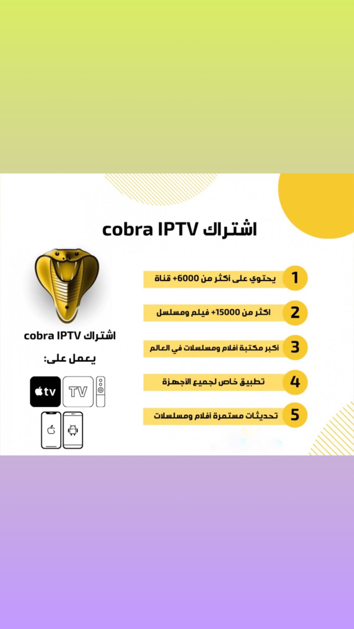 https://i.suar.me/6Mnln/l تطبيق كوبرا تطبيق على الجوالات والتلفزيونات الذكية يوجد فيه اكثر من ١٠ الاف قناة و اكبر مكتبة افلام ومسلسلات متجددة يوميا وقنوات مشفرة مثل بي ان سبورت . الاشتراك مدته عام كامل وعليه ضمان سنة كاملة لمعلومات اكثر والاشتراك ؛ https://vipstore0.com/products/Iptv |