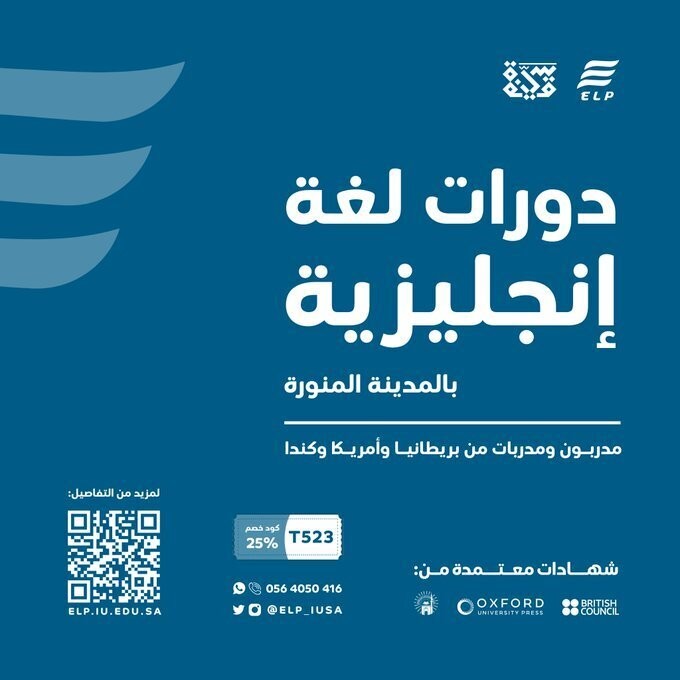 https://i.suar.me/W43Ae/m *دورات لغة إنجليزية بالجامعة الإسلامية بالمدينة المنورة* كود خصم ٢٥%: BH523 دورات لغة إنجليزية (حضورية) لشهر مايو - يونيو 2023 لـ: الرجال (18 عاماً فما فوق) النساء (18 عاماً فما فوق) جميع المدربين والمدربات من أهل اللغة الإنجليزية (أمريكا - كندا - بريطانيا)، وجميعهم يدرسون في جامعات ومعاهد. الدراسة حضورية. تحصل في نهاية كل مستوى على شهادتين: 1- شهادة حضور معتمدة من أكسفورد ومن الجامعة الإسلامية بالمدينة المنورة. 2- شهادة اجتياز (غير إلزامية) معتمدة من المجلس الثقافي البريطاني ومن الجامعة الإسلامية بالمدينة المنورة. مدة الدراسة في المستوى الواحد 5 أسابيع / 5 أيام بالأسبوع / 3 ساعات ونصف باليوم الواحد (75 ساعة تدريبية). الدورة القادمة تعقد في الفترة من 21 مايو – 22 يونيو 2023م (01 ذو القعدة – 04 ذو الحجة 1444هـ). أوقات الدراسة: من 5 - 8:30 مساءً. أيام الدراسة: 5 أيام بالأسبوع (من الأحد - الخميس). آخر موعد للتسجيل هو ١٥ مايو. يوجد قبل بدء الدورة اختبار تحديد مستوى مجاني (من أكسفورد وعليه شهادة)، وهو اختبار محوسب، وبعد أن تجريه سيتم تحديد مستواك بدقة وبناءً عليه تدخل المستوى المناسب لك. سعر المستوى الواحد 2500 ريال (شامل الضريبة). ويصبح سعر المستوى الواحد بعد استخدام كود الخصم 1846.9 ريال (شامل الضريبة). والرسوم تشمل: اختبار تحديد المستوى، الكتب، الشهادات. للاستفسارات واتس: 0564050416 تويتر: @elp_iusa رابط مباشر للتسجيل: http://elp.iu.edu.sa |