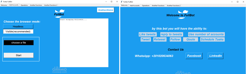 https://i.suar.me/LYnea/m يحتوي البوت علي خصائص كثيرة - البوت ممكن يشتغل بأكتر من وظيفة في وقت واحد - يعتمد البوت في المدخلات و المخرجات علي الملفات النصية txt - البوت يعمل وظائف كالاتي:- - متابعة - لايك - ريتويت - اقتباس - رد علي تويتة - تغريد - يفحص حسابات و بتأكد هل هي شغالة ام معلقا ام مغلقة - يغير صورة بروفايل و كاڤر و يغير الاسم و الوصف للحساب - يرسل رسائل - يستخرج كل المتابعين لحساب معين او عدة حسابات - طيب ده بيحصل ازاي اولا انت بيكون معاك حسابات باليوز و الباسورد بتاعها و الميل او رقم الموبايل و بتبدأ تسجلها في البوت و بعدها تقدر تستخدمهم في كل الوظايف دي حسب الوصف اللي بيكون موجود في البوت لكل وظيفة تفاصيل اكثر عبر الواتساب : WhatsApp كما يمكنكم مشاهدة كيفية عمل البرنامج من خلال الفيديو التالي : https://www.youtube.com/watch?v=WqkaU1j_ZYE |