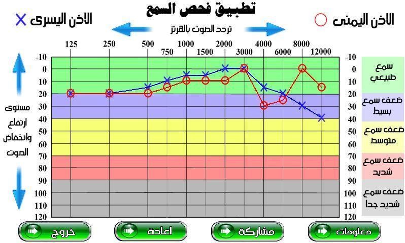 يستند هذا الاختبار على مقياس فحص السمع وهو ما يسمى قياس قوة السمع للترددات النقية (PTA)، وبعد اكمال الفحص سوف يعطيك مخطط السمع لديك في كل من أذنيك. نرحب بتعليقاتكم دائما ولا تنسو التصويت للتطبيق رابط التطبيق https://play.google.com/store/apps/d...eckyourhearing صور التطبيق https://i.suar.me/lyJYv/m https://i.suar.me/eJVY9/m https://i.suar.me/qJVYn/m |