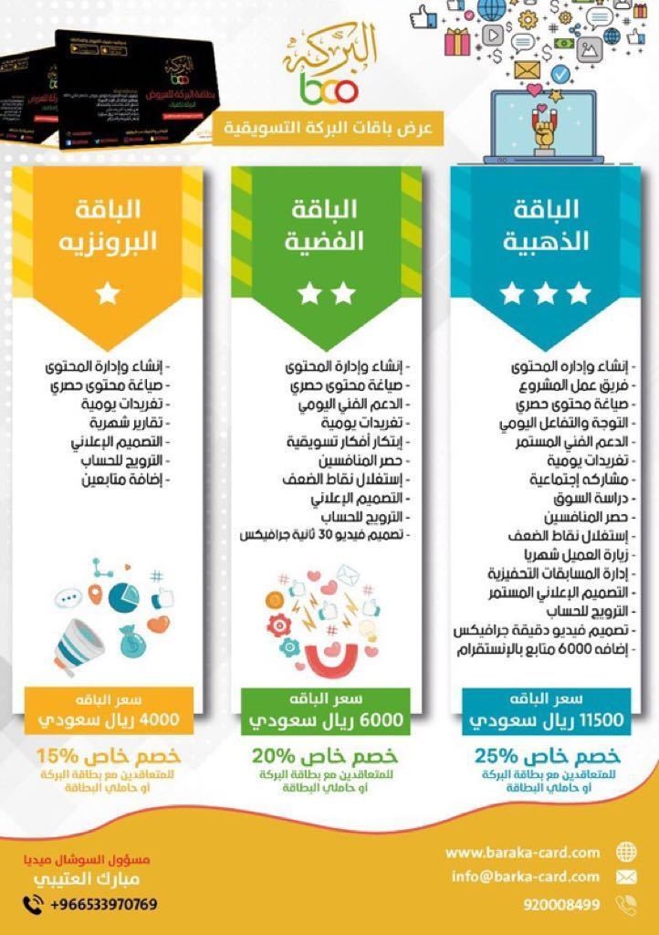 نشر الكتروني،تويتر،سناب،انستقرام https://i.suar.me/a3ZOK/l ( عرض باقات البركة التسويقية ثلاث باقات مميزة انتقي ما يناسبك ) هذه باقات خاصه بالتسويق الالكتروني والذي يشمل الشركات والمؤسسات والافراد والتي تمنحك اكثر نشرا في التويتر والانستقرام والسناب شات واضافه المتابعين عن طريق قروبات وليس سيرفرات شركتنا مقرها الدمام - الشارع الاول - المملكه العربيه السعوديه التواصل عبر الرقم الموجود بالتصميم مبارك العتيبي |