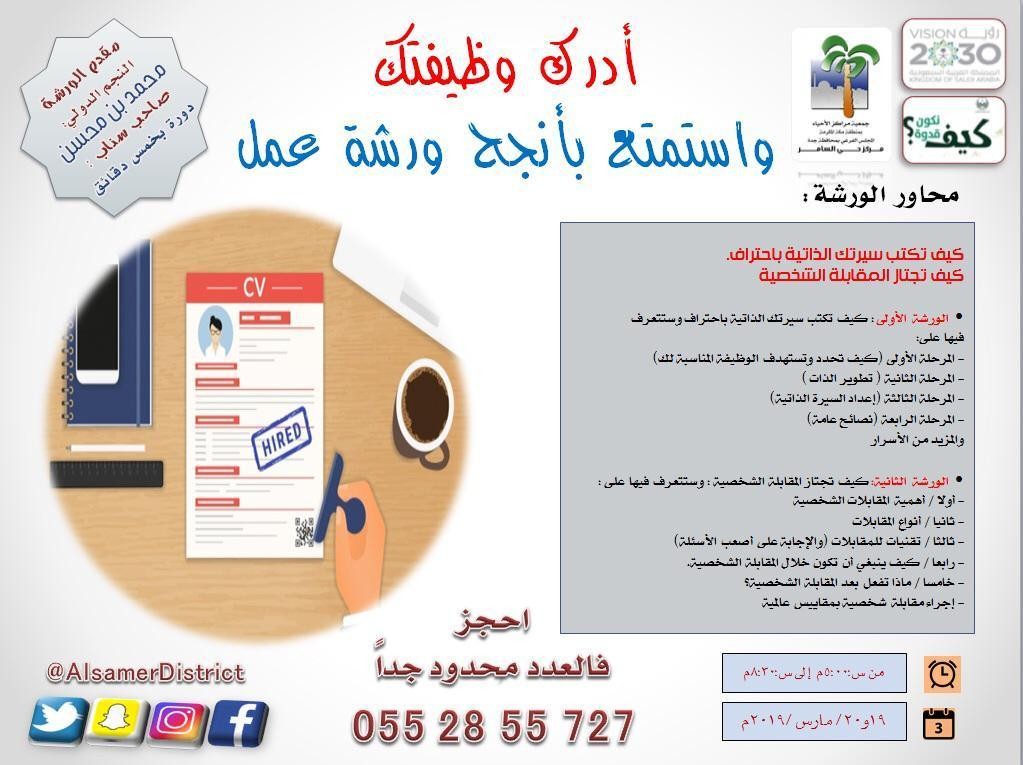 https://i.suar.me/Mgx4W/l أدرك وظيفتك.. واستمتع بأنجح ورشة عمل مع النجم المدرب الدولي محمد بن محسن صاحب سناب "دورة بخمس دقائق" لا تدع الفرصة تفوتك ورشتان عمل بجدة . يومي (الثلاثاء والأربعاء) : بتاريخ ١٩ و ٢٠ مارس ٢٠١٩ الموافق ١٢ و ١٣ رجب ١٤٤٠ في الفترة المسائية من الساعة 05:00 عصراً وحتى الساعة 08:30 مساءً ورشة كيف تكتب سيرتك الذاتية باحتراف. ورشة كيف تجتاز المقابلة الشخصية • الورشة الأولى : كيف تكتب سيرتك الذاتية باحتراف وستتعرف فيها على: - المرحلة الأولى (كيف تحدد وتستهدف الوظيفة المناسبة لك) - المرحلة الثانية ( تطوير الذات ) - المرحلة الثالثة (إعداد السيرة الذاتية) - المرحلة الرابعة (نصائح عامة) والمزيد من الأسرار • الورشة الثانية: كيف تجتاز المقابلة الشخصية : وستتعرف فيها على : - أولاً / أهمية المقابلات الشخصية - ثانياً / أنواع المقابلات - ثالثاً / تقنيات للمقابلات (والإجابة على أصعب الأسئلة) - رابعاً / كيف ينبغي أن تكون خلال المقابلة الشخصية. - خامسا / ماذا تفعل بعد المقابلة الشخصية؟ - إجراء مقابلة شخصية بمقاييس عالمية. للحجز والاستفسار أ.آدم 00966552855727 تنبيه : العدد سيكون محدود جداً. |