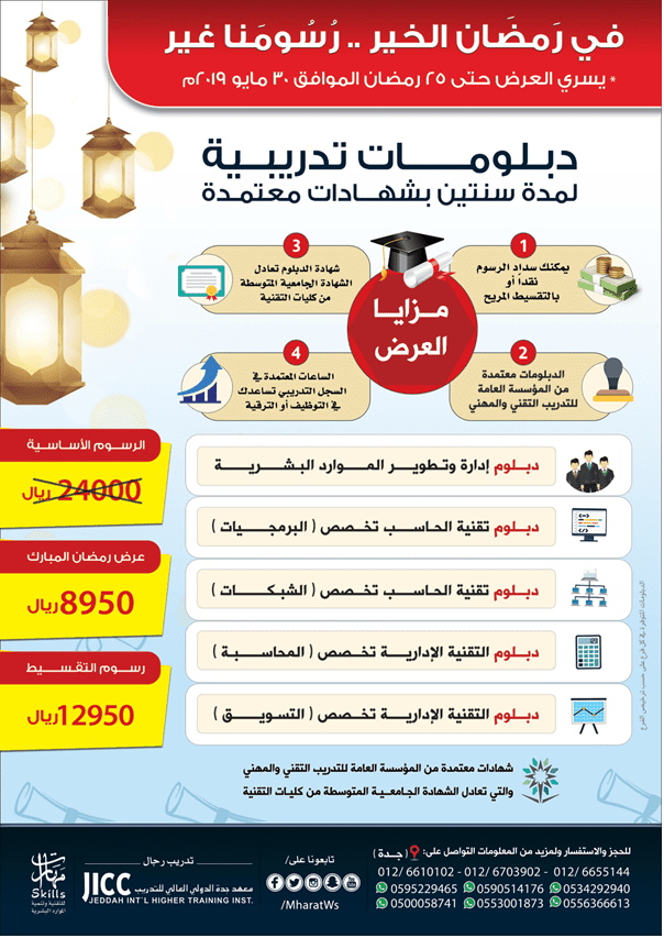 في رَمضَان الخير ... رُسُومنَا غير دبلومات تدريبية لمدة سنتين بشهادات معتمدة * يسري العرض حتى نهاية شهر مايو 2019م السداد نقداً كامل الرسوم بــ 8950 ريال السداد بدفعات ميسرة بــ 12950 ريال دبلوم إدارة وتطوير الموارد البشرية دبلوم التقنية الإدارية تخصص التسويق دبلوم التقنية الإدارية تخصص المحاسبة دبلوم تقنية الحاسب تخصص الشبكات دبلوم تقنية الحاسب تخصص البرمجيات تعقد الدبلومات في مدينة (( جدة )) 💫 *(( مزايا العرض ))* 💫 يمكنك سداد الرسوم نقداً أو بالتقسيط المريح الدبلومات معتمدة من المؤسسة العامة للتدريب التقني والمهني شهادة الدبلوم تعادل الشهادة الجامعية المتوسطة من كليات التقنية الساعات المعتمدة في السجل التدريبي تساعدك في التوظيف أو الترقية (( للاستفسار نرجو التواصل عبر الهاتف أو الجوال أو الواتس أب )) 📍 مدينة جــــدة / رجال 0126655144 -- 0126703902 0534292940 -- 0595229465 0500058741 -- 0556366613 0590514176 -- 0551108909 (( سارع بحجز مقعدك الآن وسجل عبر الرابط التالي )) http://bit.ly/2tjSOXj https://i.suar.me/jVq6B/l طوِّر لُغتكَ الإنجليزية في العطلَة الصَّيفية دورات صيفية مكثفة للصغار والكبار * خصم إضافي للإخوة والأصدقاء تعقد الدورات في مدينة (( جدة )) تبدأ بتاريخ: 23 شعبان إلى 18 رمضان (( مميزات البرنامج )) مدربين محترفين لغتهم الأم الإنجليزية مناهج بريطانية عالمية قاعات مجهزة بأحدث وسائل التعليم إمكانية إعادة الدورة مجاناً شهادات معتمدة من وزارة التعليم (( للاستفسار نرجو التواصل عبر الهاتف أو الجوال أو الواتس أب )) مدينة جــــدة / رجال 0126677602 0553740334 -- 0590038494 (( سارع بحجز مقعدك الآن وسجل عبر الرابط التالي )) http://bit.ly/2qBAKEw https://i.suar.me/3Nevr/l ... احترف التصوير الفوتوغرافي ... (( تعرَّف على أهم مَبادئ التصوير الفوتوغرافي وكيفية معالجة الصُّور باستخدام الحاسب الآلي )) فقط بــ 450 ريال تطبيق عملي على كاميرات احترافية (( تعقد الدورة في مدينة جدة )) في مقر معهد جدة الدولي العالي للتدريب مركز الجمجوم التجاري (مدينة الصين) احصل على شهادة معتمدة من المؤسسة العامة للتدريب التقني والمهني برقم ( 252264542 ) للاستفسار نرجو التواصل عبر الهاتف أو الجوال أو الواتس أب: # مدينة جــــدة / رجال 0595229465 -- 0500058741 سارع بحجز مقعدك الآن وسجل عبر الرابط التالي: http://bit.ly/2udiBOA للاطلاع على آخر عروضنا في الدبلومات والدورات التدريبية أنقر على الرابط: https://goo.gl/VzuWnZ شركة مهارات للتقنية وتنمية الموارد البشرية ® 🌹 فضلاً أنشرها لتصل من ينتظرها 🌹 https://i.suar.me/oJjEl/l 🌙 في رَمضَان الخير ... رُسُومنَا غير 🌙 (( دورة صيَانة برمجيَّات الجوَّال )) فقط بــ 850 ريال احتراف صيانة الجوالات ... طريقك لتحقيق دخل مالي ... والمنافسة في سوق العمل باحترافية تطبيق عملي وشرح نظري لمدة أسبوع تدريبي (( تعقد الدورة في مدينة جدة )) في مقر معهد جدة الدولي العالي للتدريب مركز الجمجوم التجاري (مدينة الصين) خصم خاص للمجموعات والجهات الخيريَّة احصل على شهادة معتمدة من المؤسسة العامة للتدريب التقني والمهني برقم ( 252229924 ) للاستفسار نرجو التواصل عبر الهاتف أو الجوال أو الواتس أب: # مدينة جــــدة / رجال 0126655144 -- 0126703902 0534292940 -- 0595229465 0553001873 -- 0556366613 0590514176 -- 0500058741 سارع بحجز مقعدك الآن وسجل عبر الرابط التالي: http://bit.ly/2hs8zEc للاطلاع على آخر عروضنا في دورات اللغة الإنجليزية أنقر على الرابط: http://bit.ly/2qBAKEw شركة مهارات للتقنية وتنمية الموارد البشرية ® 🌹 فضلاً أنشرها لتصل من ينتظرها 🌹 https://i.suar.me/7pjv0/l |