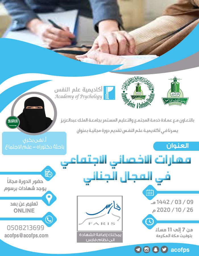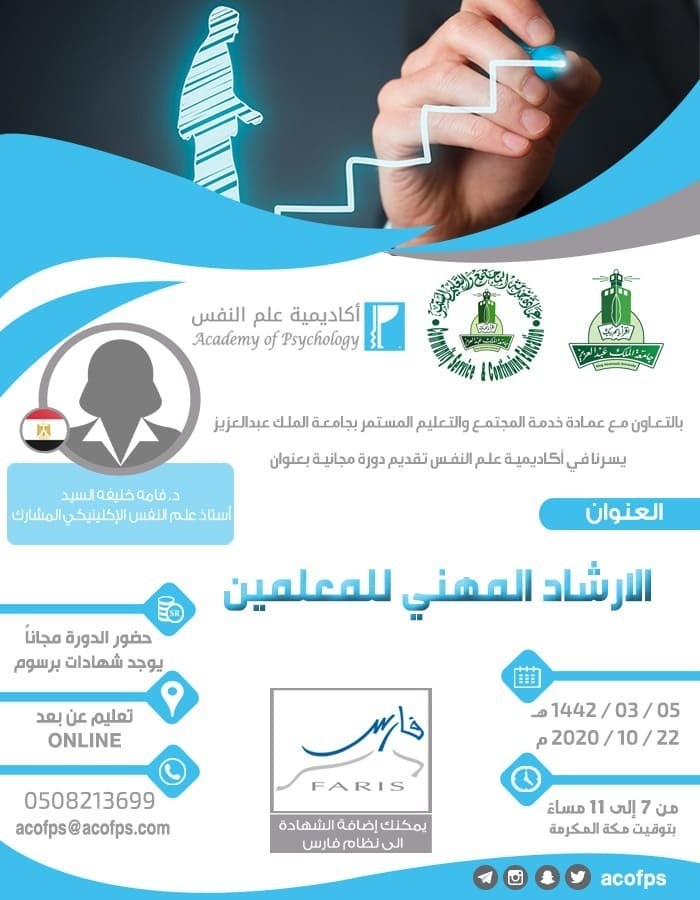 يسرنا في اكاديمية علم النفس وبالتعاون مع عمادة خدمة المجتمع والتعليم المستمر بجامعة الملك عبد العزيز الاعلان عن ( 20 دورة ) مجاناً للاطلاع على جدول الدورات والتسجيل : https://acofps.com/storage/app/media/social/dor-mjana.pdf — للاستفسارات : اتصال : 00966508213699 واتساب : https://goo.gl/9BWbQZ تحياتنا اكاديمية علم النفس https://i.suar.me/G4vwZ/l https://i.suar.me/yoljm/l https://i.suar.me/m2EJQ/l https://i.suar.me/K5vwn/l https://i.suar.me/B3vZv/l |