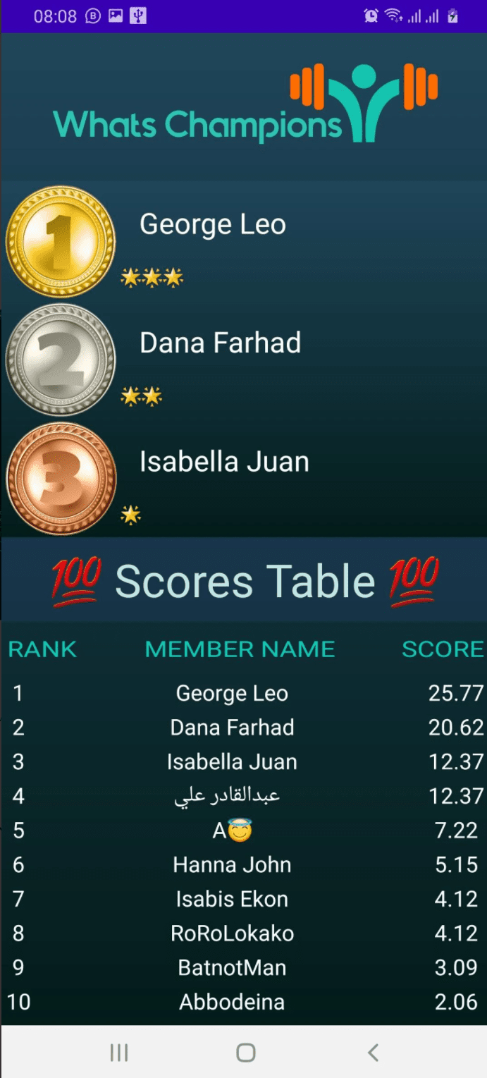 الرابط : https://play.google.com/store/apps/d....whatschampion وصف للتطبيق: تطبيق "واتس تشامبيون Whats Champion" ، يساعدك على معرفة مين أكثر شخص يشارك في جروب الواتسأب. اتبع الخطوات التالية: 1 - حمل التطبيق من على جوجل بلاي : https://play.google.com/store/apps/d....whatschampion 2 - بعد إكتمال التحميل إفتح الواتسآب. 3 - إفتح أية دردشة تريد معرفة من يشارك فيها أكثر. 4 - إفتح القائمة بإستخدام النقاط الثلاث أعلى يمين التطبيق. 5 - إضغط على More . 6 - إضغط على الخيار Export chat . 7 - إختر الخيار Without Media. 8 - إختر تطبيق Whats Champion من نافذة التطبيقات. إستمتع بقراءة النتائج، و بإمكانك مشاركة النتائج في تطبيق الواتسآب. التطبيق آمن جدا، و لا يحتفظ بأية بيانات للمستخدمين.. https://i.suar.me/pL4X9/l https://i.suar.me/X02PZ/l |