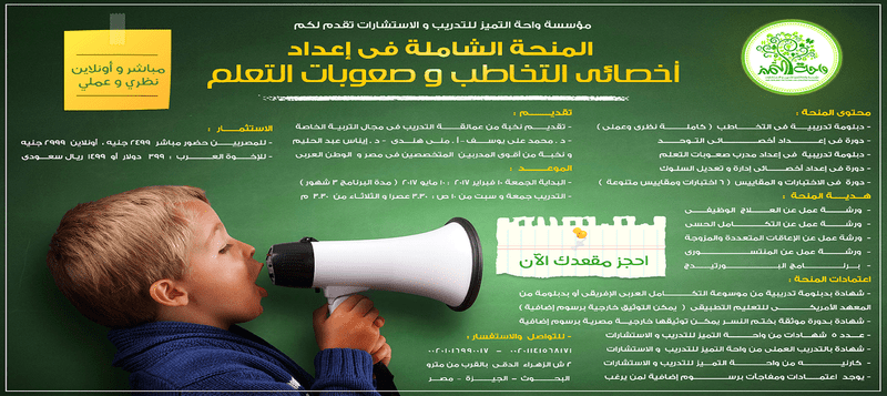 http://up.3dlat.com/uploads/3dlat.com_14032686842.gif أقوى منحة شاملة لإعداد أخصائى التخاطب و صعوبات التعلم ... الأقوى و الأعمق و الأكثر تخصصا فى مصر و الوطن العربى ... تبدأ 10 فبراير 2017 م ... على مدى 3 شهور مكثفة بشهادة 200 ساعة تدريبية ( مباشر و أونلاين ) ( 5 دبلومات و دورات + 5 ورش عمل + 6 اختبارات ومقاييس فى التربية الخاصة ) ..... فقط و حصريا فى واحـــة التميز للتدريب و الاستشارات مؤسسة معتمدة ... (نظرى و عملى ) العملى بالمستشفى اليونانى ... عمالقة التربية الخاصة فى مصر و الوطن العربى أمثال : د محمد على يوسف - أ منى هندى - د إيناس عبد الحليم ..... و نخبة من أقوى المتخصصين خبرات تعدت 20 عاما مستوى آخر من التدريب الاحترافى ... لا يمكن مقارنته .. 8 شهادات,, منها 2 تقبل التوثيق خارجية برسوم إضافية . الاستثمار للمصريين : حضور مباشر 2499 ج أونلاين 2999 ج و لللإخوة العرب 399 دولار أو 1499 ريال سعودى بدلا من 750 دولار لمزيد من التفاصيل على الرابط التالى : http://cutt.us/KjXSo رابط المدونة : http://oasisacacdmy.blogspot.com.eg/ رابط البيدج على الفيس بوك : https://www.facebook.com/%D9%88%D8%A...0906410303767/ البداية الجمعة 10 – 2 – 2017 م : 1 – 5 – 2017 م التدريب جمعة و سبت من 10 ص : 3.30 عصرا والثلاثاء من 3.30 م ، ثلاثة شهور https://i.suar.me/rE3y/m المحتـــــــــــــوى : ************* - 1 - دبلومة تدريبية فى التخاطب ( كاملة نظرى وعملى ) . 2- - دورة فى إعــــداد أخصـائـى التــوحــد . 3 - - دبلومة تدريبية فى إعداد مدرب صعــوبات التعلم . 4 – - دورة فى إعداد أخصـــائى إدارة و تعديل السلوك . 5 - - دورة فى الاختبارات و المقاييس ( 6 اختبارات ومقاييس متنوعة ) . هـــديــــــة المنحة : *************** 1 - - ورشة عمل عن العلاج الوظيفى . 2 - - ورشة عمل عن التكامل الحسى . 3 - - ورشة عمل عن الإعاقات المتعددة والوجة . 4 - - ورشة عمل عن المنتسورى . - 5 - بــــرنــامج البــــــورتيدج . الاعتمــــــــــــادات : ************* - شهادة بدبلومة تدريبية من موسوعة التكامل العربى الإفريقى أو بدبلومة من المعهد الأمريكى للتعليم التطبيقى *** يمكن التوثيق خارجية برسوم إضافية *** – شهادة بـدورة موثقة بختـم النســر .... يمكـــن توثيقها خارجيــــة برسوم إضافية . . - عــــدد 5 شهادات من واحة التميز للتدريب و الاستشارات – شهادة بالتدريب العملى من واحة التميز للتدريب و الاستشارات . - كارنيــــــــه من واحــة التمــــيز للتدريب و الاستشارات يوجد اعتمادات و مفـــــــــاجآت برسوم إضافية لمـــــــــن يــــــــــرغب . للتواصل و الاستفسار : 00201141568171 - 00201016990017 متوفران فايبر وواتساب العنوان واحــــة التمــيز مصر : )))) 2 ش الزهراء الدقى بالقرب من مترو البحوث الدور الرابع - الجيزة – مصر )))) https://i.suar.me/oEde/m |
