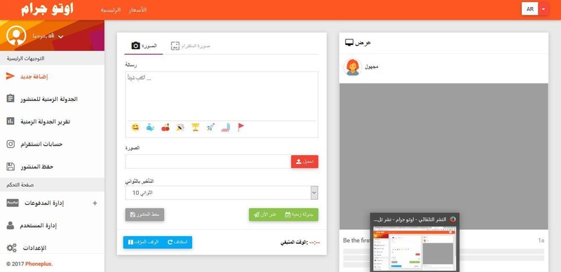 https://i.suar.me/a0l9/m النشر التلقائي للصور والفيديو على انستقرام مع تحكم شامل من المعروف كم هي أهمية التسويق الإلكتروني سواء من أجل بيع سلعة ما أو لنشر أفكار معينة، وقد كثُرت وسائل التواصل الاجتماعي وتعددت أساليبها وأدواتها، وتميز الخليج العربي باستخدام أكثر هذه الوسائل رقياً وهو منصة انستاجرام، حيث لا يخلو جهاز ذكي من هذا التطبيق المذهل، وحسب القاعدة الشائعة "الحلو ما يكمل" فإنّ أنستاجرام أيضاً ليس كاملاً، فإنّك من الصعب جداً أن تحصل على عدد كبير من الأصدقاء والمتابعين كما هو الحال في فيسبوك، وانطلاقاً من أهمية هذا التطبيق في حياتنا وخصوصاً لمن يروّج منتجاته فإن موقع "اوتو جرام" أوجد لك الحل. موقع "اوتو جرام" يتولى عنك مهام النشر وجلب العملاء، وبهذا يوفر عليك الجهد والوقت والمال، كما أنه يتمتع بإعدادت سهلة، إضافةً إلى أن العملاء والمتابعين لن يشعروا بوجود عقل إلكتروني ينشر بدلاً عنك، فهو يحاكي حركاتك تماماً. كل ما عليك تحديد عدد البوستات ومضمونها والأوقات ثم اذهب للنوم وسيشعر المتابعون أنك معهم 24 ساعة. عنوان الموقع اوتو جرام - نشر تلقائي على انستقرام مع تعدد الحسابات |