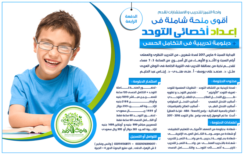 المنحة الشاملة للتخاطب و صعوبات التعلم أقوى منحة مدعمة فى التربية الخاصة لعام 2017 م المنحة الشاملة لإعداد أخصائى التخاطب و صعوبات التعلم .. على مدى 3 شهور تدريب بعدد ساعات 200 ساعة تدريبية ... البداية غدا الجمعة 17 فبراير 2017 م من 10 صباحا ، التقديم متاح ليوم الاثنين 21 فبراير بعدها بيتوقف القبول للجد د . مباشر و أونلاين ( عن بعد من أى مكان فى العالم ) ... .. الأقوى فى مصر و الوطن العربى فى مجال التربية الخاصة ... برجاء من الراغبين فى الانضمام سرعة تأكيد الحجز بسداد نصف الرسوم على الأقل ... عدد 8 شهادات و كارنيه %%%% رابط الإيفنت لمزيد من التفاصيل : https://www.facebook.com/events/1839507312984764/ https://i.suar.me/AyeN/m مع نخبة من المتخصصين هى الأقوى على مستوى الوطن العربى .. 5 دبلومات و دورات منها التخاطب كامل و صعوبات التعلم كاملة ودورة التوحد و دورة تعديل سلوك و 6 اختبارات ومقاييس و 5 ورش عمل ... يعنى من الآخر هتكون أخصائى فاهم بعمق مش كلمتين واقلب و ورقة موثقة و تجرب فى ولاد الناس المبتلين أصلا بدال متساعدهم عشان جريك ورى الورق ... الرسوم مخفضة : فقط للمصريين مباشر 2499 ج و أونلاين 2999 ج و للإخوة العرب 399 دولار أو 1499 ريال بدلا من 2800 ريال .. فالتوثيق برسوم إضافية الحضور شرط أساسى فيه نسبة غياب و امتحانات سواء مباشر أو أونلاين ... لأن هيكون فيه ترشيحات للمتفوقين و المجتهدين فقط لجهات عمل مش أى حد هنرشحه . نخبة من أقوى المتخصصين فى مجال التربية الخاصة فى مصر و الوطن العربى على سبيل المثال لا الحصر : د / محمــــد علــــى يــوسف الاستشارى و الخبير الدولى فى اضطرابات خبرة 20 عاما فى المجال دكتوراة فى طيف التوحد و ماجستير صحة نفسية . أ / منــــــى هنـــــــــدى الاستشارى الدولى فى التخاطب التوحد بالعديد من المستشفيات و الجامعات الكبرى فى ر و الوطن العربى خبرة أكثر من 20 عاما فى التربية الخاصة . د إينــــاس عبد الحلــــيم الاستشارى الدولى فى تأهيل كوادر التعامل مع الإعاقات المتعددة والدوجة و نخبــــــــــة من أقوى المتخصصين فى التربية الخاصة أصحاب الخبرة المعتبرة . الاعتمــــــــــــادات : ************* 1 - شهادة بدبلومة تدريبية من موسوعة التكامل العربى الإفريقى أو بدبلومة من المعهد الأمريكى للتعليم التطبيقى يمكن ( التوثيق خارجية برسوم إضافية ) 2 – شهادة بـدورة موثقة بختـم النســر يمكـــن توثيقها خارجيــــة ريـة برسوم إضافية . . 3 - عــــدد 5 شهادات من واحة التميز للتدريب و الاستشارات 4 – شهادة بالتدريب العملى من واحة التميز للتدريب و الاستشارات . 5 - كارنيــــــــه من واحــة التمــــيز للتدريب و الاستشارات يوجد اعتمادات و مفـــــــــاجآت برسوم إضافية لمـــــــــن يــــــــــرغب . للتواصل : 00201141568171 - 00201016990017 متوفران فايبر وواتساب عنوان واحــــة التمــيز للتدريب مصر : 2 شارع الزهراء الدقى بالقرب من مترو البحوث الدور الرابع – الجيزة .- مصر أو عن بعد من أى مكان فى العالم أقوى ثلاث منــــح تدريبية مدعمة فى التربية الخاصة فى مصر و الوطن العربى لاغنى عنهم للعاملين فى مجال التربية الخاصة وأولياء الأمور لذوى الأحتياجات الخاصة .... بداية من 17 فبراير 2017 .. مستوى آخر من التدريب و التنوع "مؤسسة واحة التميز للتدريب والإستشارات" %%%%% المنحه الثانية : - المنحه الشامله لإعداد أخصائى التــــوحـــــد و التـــكامل حـــــسى للتفاصيل اضغط هنا : https://www.facebook.com/events/268601510239406/ https://i.suar.me/yP32/m %%%%% المنحة الثالثة : منحة إعداد أخصائى تأهيل ذوى الإعاقه العقلية والإعاقات المتعددة و تضم أيضا تأهيل الإعاقة السمعية .. للتفاصيل اضغط هنا : https://www.facebook.com/events/1778407625518754/ https://i.suar.me/G23q/m *** للتواصل والأستفسار والحجز: 01016990017 - 01141568171 متوفر واتس وفايبر على الخطين |