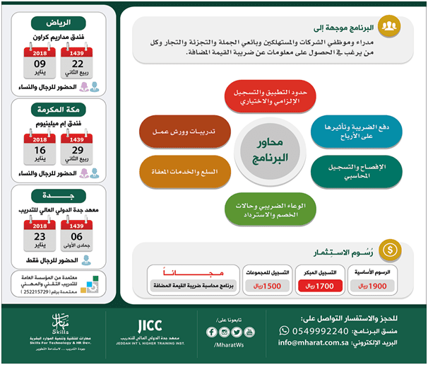 دورة ضريبة القيمة المضافة VAT مع المدرب الدكتور/ جلال العبد https://i.suar.me/VeJZJ/m مدة الدورة ثلاثة أيام تدريبية ( الفترة المسائية ) (( مكة المكرمة )) بتاريخ 16 يناير 2018م الموافق 29 ربيع الثاني 1439هـ الحضور للرجال والنساء تعقد الدورة في فندق إم ميلينيوم (( جـــدة )) بتاريخ 23 يناير 2018م الموافق 06 جمادى الأولى 1439هـ الحضور للرجال فقط تعقد الدورة في معهد جدة الدولي العالي للتدريب معتمدة من المؤسسة العامة للتدريب التقني والمهني برقم ( 252215729 ) للتسجيل أو الحجز أنقر على الرابط http://bit.ly/2zAh6Ou للاستفسار نرجو التواصل عبر الجوال أو الواتس أب 0549992240 - 0560268749 بريد إلكتروني: info@mharat.com.sa للاطلاع على الدليل التدريبي لشركة مهارات أنقر على الرابط http://bit.ly/1xMUg0O https://i.suar.me/9E9v3/m سجل في دبلوماتنا المميزه وبأسعار خيالية لاتقبل المنافسة www.mharat.com.sa https://i.suar.me/YWLAX/m لا تنسى حجز مقعدك في إحدى دورات التصاميم المميزة دورة التصميم المعماري باستخدام الاوتوكاد دورة المونتاج التلفزيوني بإستخدام البريمير و الأفترإيفكت دورة التصميم ثلاثي الابعاد 3dmax دورة التصميم الإعلاني باستخدام الفوتوشوب والاليستريتور www.mharat.com.sa https://i.suar.me/zBnJv/m |