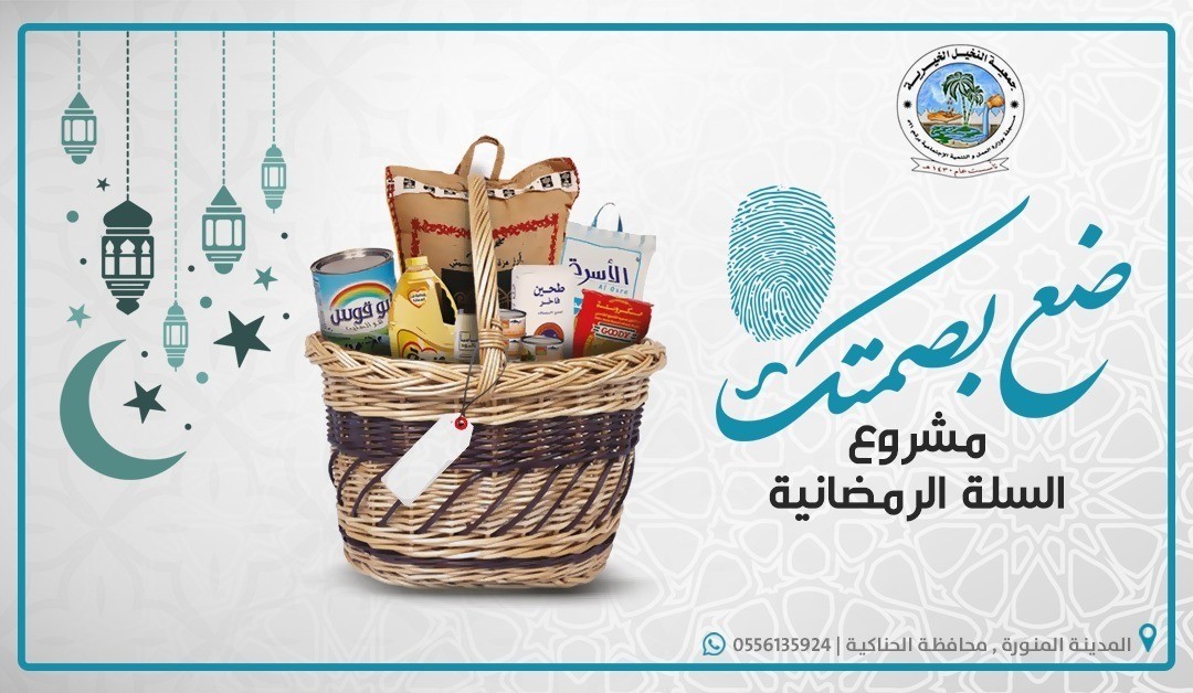 https://i.suar.me/dzGAJ/l مشروع السلة الغذائية الرمضانية مكونة من اثنى عشر صنفا . قيمة السلة الواحدة (190) ريال . ضع بصمتك و ساهم معنا.. قال رسول الله صلى الله عليه وسلم : من فطر صائما كان له مثل اجره ، غير انه لا ينقص من اجر الصائم شيء) جـمـعـيــــة النـخـيــــل الخيـــريــة مسجلة بوزارة العمل والتنمية الإجتماعية برقم (521) جوال 0556135924 رقم الحساب بمصرف الراجحي SA1780000269608010177000 الموقع http://www.jnk1430.com |