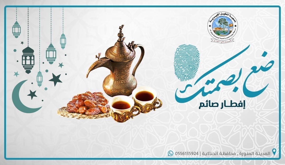 https://i.suar.me/pzX9y/l مشروع افطار صائم قال رسول الله صلى الله عليه وسلم (من فطر صائما كان له مثل أجره غير انه لاينقص من اجر الصائم شيء ) قيمة الوجبة 12 ريال . قيمة السهم 50 ريال . ضع بصمتك و ساهم معنا.. جـمـعـيــــة النـخـيــــل الخيـــريــة مسجلة بوزارة العمل والتنمية الإجتماعية برقم (521) جوال 0556135924 رقم الحساب بمصرف الراجحي SA1780000269608010177000 الموقع http://www.jnk1430.com |