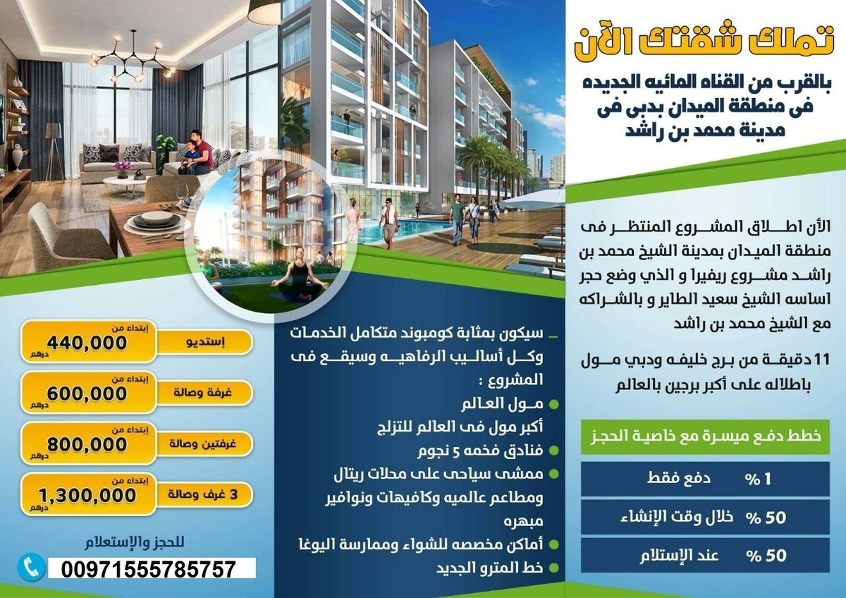 شقق للبيع في دبي بالأقساط https://i.suar.me/LOrjj/l تملك شقتك الان بالقرب من القناة المائيه الجديدة فى منطقة الميدان ب دبى فى مدينة محمد بن راشد ال مكتوم. إطلاق المشروع المنتظر فى منطقة الميدان ب مدينة الشيخ محمد بن راشد (مشروع ريفيرا) من شركة عزيزي للتطوير العقاري و الذي وضع حجر اساسه الشيخ سعيد الطاير و بالشراكة مع الشيخ محمد بن راشد 11دقيقه من برج خليفه و دبي مول بإطلاله على أكبر برجين بالعالم سيكون بمثابة كومباوند متكامل لخدمات وكل أساليب الرفاهيه وسيقع فى المشروع مول العالم أكبر مول في العالم للتزلج فنادق فخمه_5نجوم ، ممشي سياحي على محلات ريتال و مطاعم عالميه و كافيهات و نوافير مبهره أماكن مخصصه لل شواء و ممارسة اليوغا ، خط المترو الجديد خطط دفع ميسره مع خاصية الحجز دفع فقط ١٪ ٥٠٪ خلال وقت الانشاء ٥٠٪ عند الاستلام مع إمكانية تمويل المتبقي عند الاستلام لمدة 25 عام استديوهات ابتداء من ٤٤٠ الف غرفة و صاله ابتداء من ٦٠٠ الف غرفتين و صاله ابتداء من ٨٠٠ الف ثلاث غرف و صاله ابتداء من ١.٣ مليون للتفاصيل الرجاء الإتصال أو الواتساب على الرقم 00971555785757 شركة عزيزي للتطوير العقاري – مشروع ريفيرا – مشروع الميدان في دبي – شقق للبيع في دبي – عقارات دبي – استثمار في دبي – Azizi Riviera Apartment Meydan , Azizi Riviera , Azizi Riviera at Meydan City Dubai , |