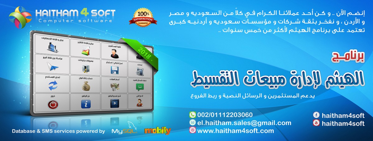 برنامج الهيثم لإدارة مبيعات التقسيط يدعم المستثمرين و الرسائل النصية و ربط الفروع https://i.suar.me/Y59BX/l هل لديك شركة أو مؤسسة و تعمل بمجال البيع بالتقسيط ؟ https://www.youtube.com/watch?v=ieNfmCvE1iQ https://i.suar.me/MdOV3/l https://i.suar.me/9g6J3/l https://i.suar.me/gZL62/l تعريف البرنامج هو برنامج لإدارة بيانات و حسابات الشركات أو المؤسسات أو المكاتب التي تعمل بمجال البيع بالتقسيط و يقوم بمتابعة أقساط العملاء و إشعارهم تلقائياً عن طريق الرسائل النصية على الجوال , و يتيح لك تحصيل أقساط العملاء بأكثر من طريقه ( سداد القسط كاملاً أو جزء منه أو حتى سداد مبكر للأقساط كما يمكنك إعفاء العميل من المديونيه كلها أو جزء منها ) و كذلك إدارة حسابات المخزون و مصروفات و إيرادات الشركه مع إمكانية عرض و طباعة تقارير مفصله لكل حسابات الشركه و المستثمرين و العملاء و الكثير من الإمكانيات الأخرى . أهم مميزات البرنامج إنشاء عقود العملاء و المستثمرين إصدار الكمبيالات و المخالصات و سندات القبض و الصرف كشف حساب بجميع معاملات و أرباح الشركه و المستثمرين كشف حساب بجميع عقود و معاملات العملاء عرض تقارير متنوعه و مفصلة لجميع الحسابات و المعاملات مع إمكانية تصدير التقارير بصيغة PDF إرسال رسائل نصيه للعملاء و المستثمرين ( يدوياً و آلياً ) مع إمكانية إدراج متغيرات في الرساله ليتم إستبدالها تلقائياً بالبيانات التي تخص العميل أو المستثمر المرسل إليه , علماً بأن هذه الخدمه مدفوعة إعتماد أكثر من نظام ربح للشركه من المستثمرين دعم قارئ الباركود إمكانية ربط عدة نقاط بيع مع بعضها سواء للفرع الواحد أو عدة فروع على الشبكه الخارجيه بحيث تُمكن عملائك من سداد أقساطهم في أي فرع تابع لك إدارة حسابات المخزون و مصروفات و إيرادات الشركه إمكانية إستخدام التاريخ الهجري أو الميلادي إمكانية البحث المرن عن العملاء المتأخرين , المتعثرين , اقترب أو و جب موعد سدادهم و غيرها عرض إحصائيات شاملة لحسابات الشركه و المستثمرين و العملاء إمكانية تحديد نوع الدفعات للأقساط ( يوميه , أسبوعيه , شهريه , و غيرها ) إمكانية إضافة مستندات ضوئيه لكلاً من العملاء و المستثمرين نظام مراسله نصيه بين نقاط البيع سواء داخل الفرع أو خارجه نظام يُمكن مستثمرين الشركه من متابعة حساباتهم قائمة سوداء بعملاء نحذرك تلقائياً عند التعامل مع أحد منهم إمكانية إضافة عدة مستخدمين مع تحديد صلاحيات محدده لكل مستخدم إمكانية إلغاء التعاقد أو إلغاء أي عملية سداد نسخ إحتياطي للبيانات يدوياً و تلقائياً مع خاصية إرسال نسخه إحتياطيه من البيانات للبريد الإلكتروني الخاص بك تسجيل عدد غير محدود للبيانات و ذلك بفضل الإعتماد على قاعدة بيانات My SQL و العديد من الوظائف الأخرى ... للطلب يمكنك الإتصال أو المراسله 00201112203060 ( WhatsApp ) البريد الإلكتروني el.haitham.sales@gmail.com الدعم الفني و التحديثات مجانيه دائماً بدون أي رسوم أو إشتراكات سنويه أو شهريه لمزيد من التفاصيل يمكنكم زيارة موقعنا على الإنترنت https://www.haitham4soft.com |
