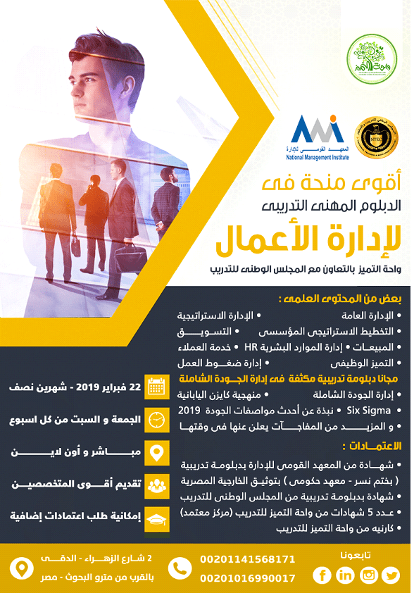 أقوى ماجستير مهنى للصحــــة النفسيــة واحة التميز Mental Health PLUS ماجستير مصغر فى الإرشاد الزواجى ماجستير مصغر فى العلاج السلوكى و المعرفى البداية 22 فبراير 2019م - لمدة 3 شهور - عمالقة المتخصصين مباشر و أونلاين - عمالقة المتخصصين صعب المقارنة https://i.suar.me/wOXxp/l بعض من المحتوى العلمى : - علم وظائف الأعضاء - علم نفس اجتماع - علم نفس الطفـــل - علاج سلوكى و معرفى - علم نفس الشخصية - الإرشاد الزواجى Life Coaching و المزيد من المفاجآت يعلن عنها فى وقتها https://i.suar.me/gK9W1/l الاعتمادات : - شهادة من المعهد الامريكى للدراسات التربوية بماجستير مهنى A I E S H R D - شهادة بدبلومة تدريبية بختم النسر و تقبل التوثيق خارجية ( برسوم إضافية - عدد 5 شهادات من واحة التميز للتدريب ( مركز معتمد من جهتين تابعتين لرئاسة مجلس الوزراء المصرى ) - كارنيه من واحة التميز للتدريب للإطـلاع على برامجنا برجاء الضغط الرابط التالى: http://cutt.us/yPAHA للتواصل معنا عبر الرسائل البيدج الرئيسية لواحة التميز برجاء الضغط على الرابط التالى https://www.facebook.com/WahaELTamyooz/ للتواصل : 00201141568171 - 00201016990017 متوفر واتساب و فايبر العنوان : 2 شارع الزهراء الدقى بالقرب من مترو البحوث - مصر من منح واحة التميز للتدريب المتاحة أقوى دبلومة لإدارة الأعمال من واحة التميز BUSINESS ADMINISTRATION PLUS دبلومة فى الجودة الشاملة .. مجانااااا Total Quality Management ( FOR FREE ) من واحة التميز للتدريب بالتعاون مع المجلس الوطنى للتدريب و التعليم عايز أقوى تدريب احترافى قوى ومتخصص يفرق معاك فى مستقبلك ؟ و تقدر تشتغل وترتقى و تترقى بيه داخل وخارج مصر قطاع خاص وحكومى ؟ فى تخصص إدارة الأعمال ؟ ومعاه دبلومة مجانية فى إدارة الجودة الشاملة دبلوم تدريبى معتمد من المعهد القومى لــلإدارة ( معهد حكومى – بختم النسر ) ؟ و كمان موثق خارجية مصرية ؟ وكمان معتمد من المجلس الوطنى للتدريب و التعليم وواحـــــة التميز للتدريب المدربون من النخب فى التخصص على مستوى الوطن العربى +++ A و التدريب مباشر و أونلاين عن بعد من أى مكان فى الكون ؟ و باشتراك مدعم وخصم خاص حتى 18 فبراير 2019 م و للمجموعات . بادر بالحجز فالعدد محدود جدااا مباشر و أونلاين - البداية 22 فبراير 2019م - لمدة شهرين نصف - الجمعة و السبت https://i.suar.me/Y204V/l بعض من المحتوى العلمى لدبلومة إدارة الأعمال : - الإدارة العامة - الإدارة الاستراتيجية - التخطيط الاستراتيجى المؤسسى - التســويق - المبيعـــات - إدارة الموارد البشرية HR - خدمة العملاء - التميز الوظيفى - إدارة ضغوط العمل إدارة ضغوط العمل PLUS دبلومة تدريبية مكثفة في إدارة الجودة الشاملة. FOR FREE - إدارة الجودة الشاملة - منهجية كايزن اليابانية kaizen Six Sigma - نبذة عن أحدث مواصفات الجودة UPDATED For 2018 - 2019 و المزيد من المفاجآت يعلن عنها فى وقتها الاعتمــــادات : - شهادة من المعهد القومى لــــــــلإدارة بدبلومة تدريبية ( بختم نسر - المعهد حكومى ) - بتوثيق الخارجية المصرية - شهادة بدبلومة تدريبية من المجلس الوطنى التدريب و التعليم - عدد 5 شهادات من واحة التميز للتدريب ( المركز معتمد من الجهاز المركزى للتنظيم و الإدارة التابع لرئاسة مجلس الوزراء المصرى ) - كارنيه من واحة التميز للتدريب إمكانية طلب اعتمادات إضافية مصرية و دولية لمن يرغب . للإطـلاع على برامجنا برجاء الضغط الرابط التالى: http://cutt.us/yPAHA https://i.suar.me/zdWVl/l للتواصل معنا عبر الرسائل البيدج الرئيسية لواحة التميز برجاء الضغط على الرابط التالى https://www.facebook.com/WahaELTamyooz/ للتواصل : 00201141568171 - 00201016990017 متوفر واتساب و فايبر العنوان : 2 شارع الزهراء الدقى بالقرب من مترو البحوث - مصر خصم خصم خصم متاح الانضمام و الحجز فى أقوى منح مدعمة و المنحة الشاملة لإعداد أخصائى التربية الخاصة واحة التميز للتدريب للمنح التالية التفاصيل بصور الإعلان : للتواصل معنا عبر الرسائل البيدج الرئيسية لواحة التميز برجاء الضغط على الرابط التالى https://www.facebook.com/WahaELTamyooz/ Website : wahaacademy.org للتواصل : 00201141568171 - 00201016990017 متوفر واتساب و فايبر العنوان : 2 شارع الزهر