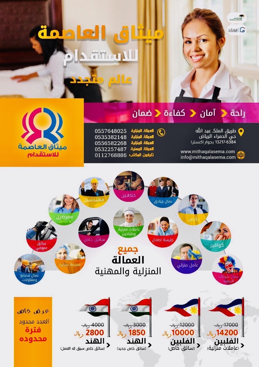 ميثاق العاصمة للإستقدام عرض خاص للإستقدام من دولة الفلبين عاملة منزلية بتكلفة ١٤٢٠٠ ريال والكمية محدودة للإستفسارات نرجوا التواصل مع خدمة العملاء 0532186244 0557648025 0535382148 0532257487 0112768886 https://www.mithaqalasema.com/ https://i.suar.me/Egv53/l https://i.suar.me/Pev9N/l https://i.suar.me/W2E0a/l |