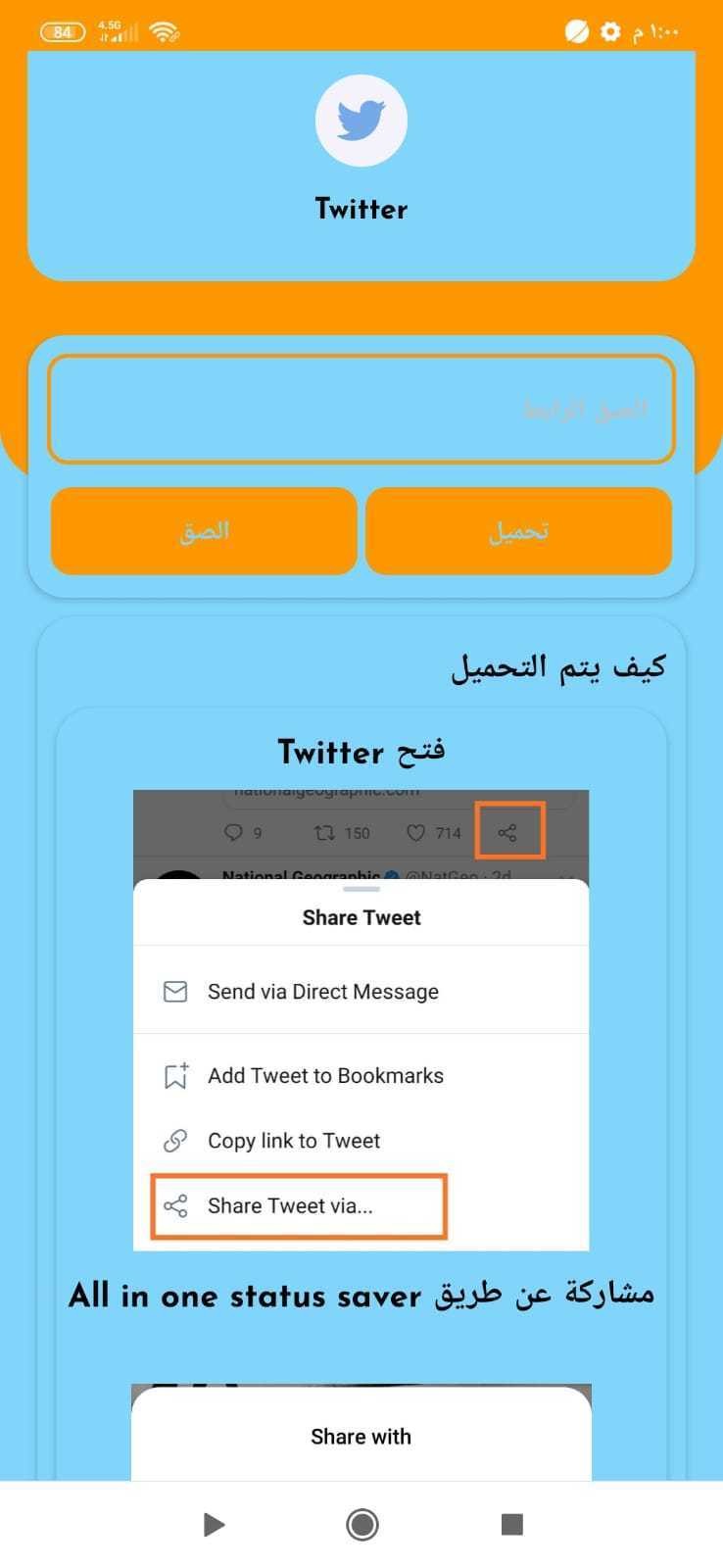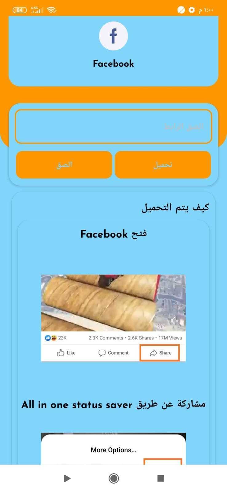 وصف للتطبيق وشرح لطريقة الاستخدام هذا التطبيق أحد أفضل تطبيقات الأندرويد على الانترنت لتحميل مقاطع الفيديو والصور من مواقع التواصل الاجتماعي، إن هذا التطبيق هو تطبيق رائع يجعل من السهل جدا الوصول الى كل الفيديوهات الموجودة على هاتفك ،بالإضافة الى التحميل السريع لأفضل المقاطع الموجودة على مواقع التواصل الاجتماعي... https://i.suar.me/gxezK/l رابط تحميل التطبيق https://play.google.com/store/apps/d...sh.statussaver https://i.suar.me/7A71w/l طريقة الاستخدام 1) تثبيت التطبيق على هاتفك ، ولا تحتاج الى بقاء التطبيق مفتوح. 2) عند فتح احد مواقع التواصل الاجتماعى وليكن كمثال ( الفيس بوك ، او انستغرام ، او التيك توك الخ من التطبيقات )، ومشاهدة فيديو وترغب بتحميله الى هاتفك الشخصى . 3) تقوم بالضغط على ايقونة مشاركة الموجودة اسفل هذا الفيديو . 4) تظهر لك من ضمن القائمة التى فتحت صورة ايقونة التطبيق ، فتقوم بالضغط عليها. 5) احيانا عند الضغط على مشاركة تظهر ايقونة ( خيارات اضافية ) تقوم بالضغط عليها فيظهر لك صورة ايقونة التطبيق، فتقوم بالضغط عليها 6) عند الضغط على ايقونة التطبيق ، يتم نقلك تلقائيا الى صفحة من صفحات البرنامج ، تقوم فقط بالضغط على تحميل ، فيتم التحميل مباشرة. 7) تجد الفيديوهات المحملة في معرض الفيديوهات بالهاتف. 8) يوجد طريقة اخرى للتحميل وهى عن طريق نسخ رابط الفيديو المرغوب بتحميله ، وفتح التطبيق وادخال هذا الرابط في المكان المخصص له ، وبتقوم بعمل بتحميل . https://i.suar.me/9rmE0/l *** التطبيق سيتم تحديثه وتطويره ، للارتقاء به ، والوصول الى افضل مستوياته **** نرجو دعمكم لنا ، لتستمر خدماتنا بكم نرتقى *** https://i.suar.me/Vp4e0/l رابط تحميل التطبيق https://play.google.com/store/apps/d...sh.statussaver |