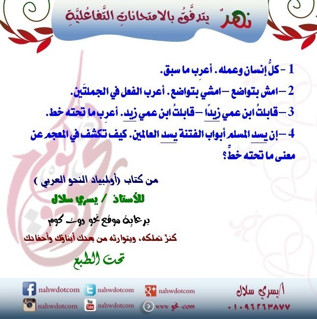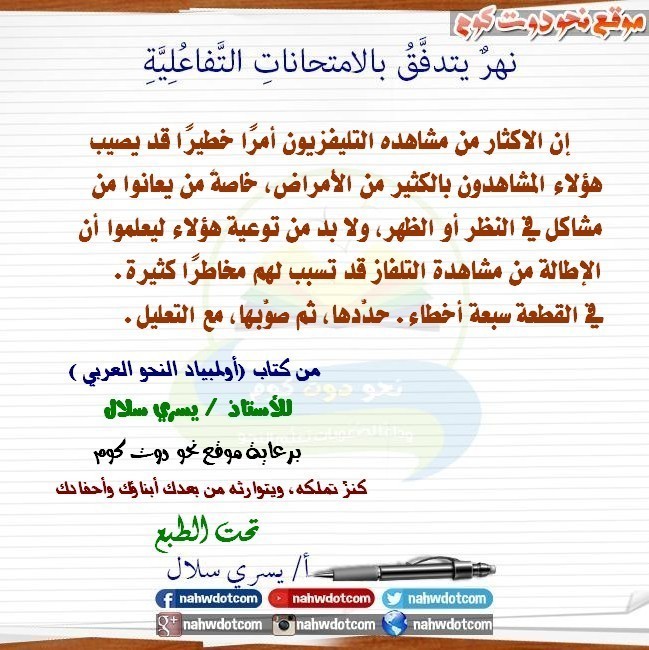 https://i.suar.me/L2Xo/m كتاب أولمبياد النحو العربي https://i.suar.me/2a39/va متَّع عقلَكَ كنز تملكه، ويتوارثه من بعدك أبناؤك وأحفادك عندما يكون تعلُّم النحو متعةً https://i.suar.me/a52l/m آلاف الأسئلة والألغاز النحوية للصفوف من الصف الرابع الابتدائي وحتى الصف الثالث الثانوي الأسئلة مجابة بالكامل وبالتفصيل https://i.suar.me/nOKg/va وكل سؤال مكتوب أمامه الصف المستهدف من السؤال الكتاب من تأليف الأستاذ يسري سلال .. وهو خبير سابق بوزارة التربية والتعليم، كما أنه صاحب ومدير شبكة نحو دوت كوم الكتاب موسوعة شاملة تتكون من حوالي 525 صفحة https://i.suar.me/leKA/m يتوفر من الكتاب نسختان: النسخة الأولى مطبوعة، والنسخة الثانية بصيغة بي دي إف النسخة اليبي دي إف تضم حوالي 650 صفحة، مع توفُّر خاصية الارتباطات التشعبية لربط كل سؤال بإجابته وكل إجابة بالسؤال الخاص بها لسهولة الانتقال داخل الكتاب بوجود عبارة (اضغط هنا لمعرفة الإجابة ) تحت كل سؤال، وعبارة (اضغط هنا للعودة إلى السؤال ) تحت كل إجابة https://i.suar.me/q5Kl/m الكتاب برعاية موقع نحو دوت كوم https://www.youtube.com/watch?v=7wKe...ature=youtu.be |