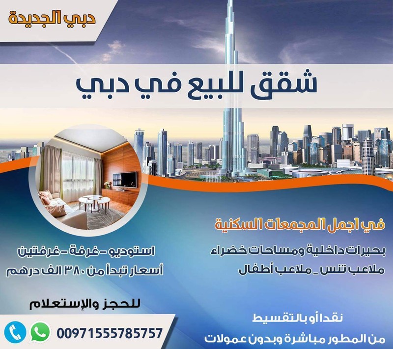 https://i.suar.me/9Yw0/m فرصــة للتملك والاستثمـار شـقـق للبيع فى بحيرات دبـى (دبي لاجون) وعلى نظام أقساط ميسرة من المطور مباشرة دبي لاجون – DUBAI LAGOON – أي سويتس - iSuites مشروع دبي لاغون في مجمع دبي للاستثمار من شركة شون العقارية Dubai Lagoon يمكنكم الاتصال او المراسلة واتس اب للحجز والاستفسار على الرقم: 00971555785757 ابتداء من 330 ألف درهم فقط للاستديو و 550 ألف للغرفة وصالة وبعائد استثماري يصل الى 14 % سنويا، من المطور مباشرة، بدون عمولات وبنظام اقساط ممتاز، يوجد غرفة وصالة ويوجد غرفتين وصالة. يضم مشروع دبي لاجون 54 بناية ويتميز بقربه من مطار المكتوم الدولي في دبي الجنوب والذي يعد أقرب مشروع سكني استثماري من منطقة اكسبو دبي 2020 كما يتميز بوجود بحيرات بداخله التى سيتم الاشراف على تنفيذها شركة كريستال لاجون العالمية. بشكل أدق يقع مشروع بحيرات دبى فى منطقة محمع دبى للأستثمار 1 - 4 كيلو من منطقة إكسبو 2020 حيث فازت دولة الإمارات بشرف إستضافة معرض إكسبو 2020 دبي، وستكون هذه المرة الأولى التي يُنظم فيها المعرض في منطقة الشرق الأوسط وشمال أفريقيا وجنوب آسيا ومن المتوقع أن يجذب معرض إكسبو2020 دبي 25 مليون زيارة خلال فترة انعقاده، وأن يأتي 70 بالمئة من الزوار من خارج دولة الإمارات العربية المتحدة. كما يبعد 4 كيلو ايضا من مطار مطار آل مكتوم الدولى مطار المستقبل في قلب “دبي ورلد سنترال” الذي من المقرر أن يستوعب عند إستكمال بنائه طاقة شحن سنوية تقدر بـ 12 مليون طن وأكثر من120 مليون راكب، ليكون بحق مطار المستقبل المرافق الموجودة بالمشروع: · مسجد · مسابح مائية عدد 4 · مطاعم · ملاعب تنس عدد 2 · نوادي لياقة ورياضة عدد 4 (عدد 2 نساء و عدد 2 رجال) “دبي الجنوب” التي تضمّ أكبر مطار في العالم، مطار آل مكتوم الدولي، وموقع معرض إكسبو 2020، هي مدينة قائمة على على مخطّط رئيسي، تبلغ مساحتها 145 كيلومتراً مربّعاً، وترتبط ارتباطًا مباشرًا ببنية تحتية حديثة عن طريق السكك الحديدية والطرق البرية والبحرية والجوية. والجدير بالذكر أنّ هذا المجمّع سيوفّر مناطق اقتصادية لتشجيع الأعمال وريادة الأعمال، فضلًا عن قُرى سكنيّة لتأمين نوعيّة حياة لا تُضاهى. للتفاصيل:00971555785757 |