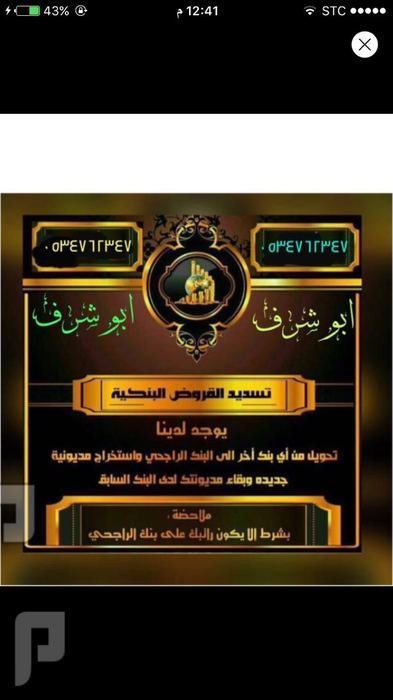 https://i.suar.me/Bj0Or/m (((السلام عليكم ورحمة الله وبركاتة))) كل عام وانتم بخير للراغبين بالقروض الشخصية وسداد المتعثرات بسمه ✔الان يوجد تحويل من اى بنك اخر الى بنك الراجحي وغيره ان شاء الله تعالى واستخراج قرض جديد وبقاء القرض لدى البنك السابق لجميع الموظفين مدنيين وغيرهم والشركات شرط ان يكون بنك الراجحي وغيره معتمد لدى البنوك اهم شي عدم وجود تعثرات الا اذا بنك البنك الزراعي والبنك العقاري فقط كما يوجد سداد لجميع التعثرات ⚫ملاحظة ::: الخدمات للرجال فقط لا غير لا يتواصل معي غير الجاد ابو شرف /// 0534762347📞 |
