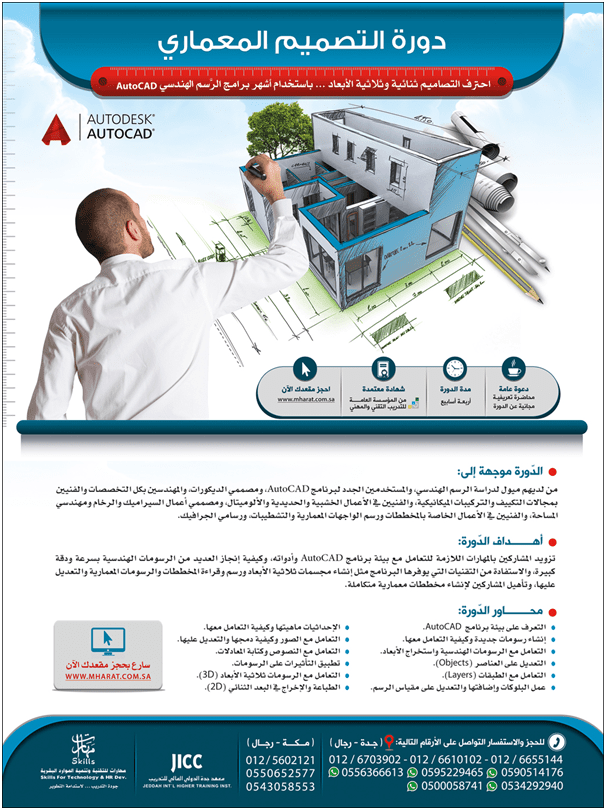بدأ التَّسجيل في دورة ... التصميم الإعلاني احترف التعامل مع أشهر برامج التصميم الجرافيكي فوتوشوب إليستريتورإنديزاين Photoshop + Illustrator + InDesign ندعوكم لحضور محاضرة تعريفية مجاناً عن الدورة https://i.suar.me/BjKng/l تعقد الدورة في مدينة (( جدة ، مكة المكرمة ، ينبع )) مدة الدورة أربعة أسابيع معتمدة من المؤسسة العامة للتدريب التقني والمهني برقم (1098001) سارع بحجز مقعدك الآن بخصومات تصل إلى 45% في دورات التصاميم من خلال التسجيل عبر الرابط التالي: http://bit.ly/2sb0Cuc للاستفسار نرجو التواصل عبر الهاتف أو الجوال أو الواتس أب: ** مدينة جدة / رجال ** 0126655144 -- 0126703902 0590514176 -- 0595229465 0500058741 -- 0556366613 0534292940 ** مدينة مكة المكرمة / نساء **0125454949 0555881765 -- 0509274943 ** مدينة ينبع / نساء ** 0143221888 -- 0554510252 بريد إلكتروني: info@mharat.com.sa للاطلاع على الدليل التدريبي لشركة مهارات أنقر على الرابط: http://bit.ly/1xMUg0O https://i.suar.me/6mK6B/l إسأل أيضا عن دورة التصميم المعماري احترف التصاميم ثنائية وثلاثية الأبعاد ... باستخدام أشهر برامج الرَّسم الهندسي AutoCAD http://bit.ly/2BVY2aX https://i.suar.me/ErKL3/l إحترف أيضا دورة المونتاج التلفزيوني ومؤثرات الفيديو الرقمية أدوبي بريمير– أدوبي أفتر إيفكت www.mharat.com.sa https://i.suar.me/WWxVa/l إستفسر أيضا عن دورة التصميم ثلاثي الابعاد 3dmax www.mharat.com.sa https://f.top4top.net/p_7743carf1.png |