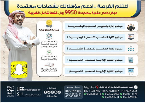 دبلومات تدريبية معتمدة مُــؤهلاتك ... تُحَقق أَحلامُك ادعم مؤهلاتك بشهادات معتمدة عرض خــــاص ولفترة محدودة 9950 ريال فقط شامل الضريبة http://i.suar.me/7199o/l دبلوم إدارة وتطوير الموارد البشرية دبلوم التقنية الإدارية تخصص التسويق دبلوم التقنية الإدارية تخصص المحاسبة دبلوم تقنية الحاسب تخصص البرمجيات دبلوم تقنية الحاسب تخصص الشبكات (( مزايا الدبلومات )) شهادات معتمدة من المؤسسة العامة للتدريب التقني والمهني شهادات مصنفة من وزارة الخدمة المدنية إمكانية مواصلة الدراسة بعد الدبلوم (( للاستفسار نرجو التواصل عبر الهاتف أو الجوال أو الواتس أب )) مدينة جــــدة / رجال 0126655144 -- 0126703902 0534292940 -- 0595229465 0500058741 -- 0556366613 0590514176 مدينة جــــدة / نساء 0126520074 0126611764 -- 0504328201 (( سارع بحجز مقعدك الآن وسجل عبر الرابط التالي )) http://bit.ly/2tjSOXj إسأل أيضا عن دورة المهارات الاحترافية في إدارة الموارد البشرية http://www.mharat.ws/show.html?id=97 http://i.suar.me/Ve77w/l سارع بحجز مقعدك الآن بخصومات تصل إلى 45% في دورات التصاميم من خلال التسجيل عبر الرابط التالي: دورة التصميم الإعلاني www.mharat.com.sa http://i.suar.me/9EYYe/l إسأل أيضا عن دورة التصميم المعماري احترف التصاميم ثنائية وثلاثية الأبعاد ... باستخدام أشهر برامج الرَّسم الهندسي AutoCAD http://bit.ly/2BVY2aX http://i.suar.me/YWggY/l إحترف أيضا دورة المونتاج التلفزيوني ومؤثرات الفيديو الرقمية أدوبي بريمير – أدوبي أفتر إيفكت www.mharat.com.sa http://a.top4top.net/p_803zdw391.png إستفسر أيضا عن دورة التصميم ثلاثي الابعاد 3dmax www.mharat.com.sa http://a.top4top.net/p_803u2vj11.png البرنامج العام للغة الإنجليزية http://www.mharat.ws/show.html?id=57 http://e.top4top.net/p_803qcg2l1.png |